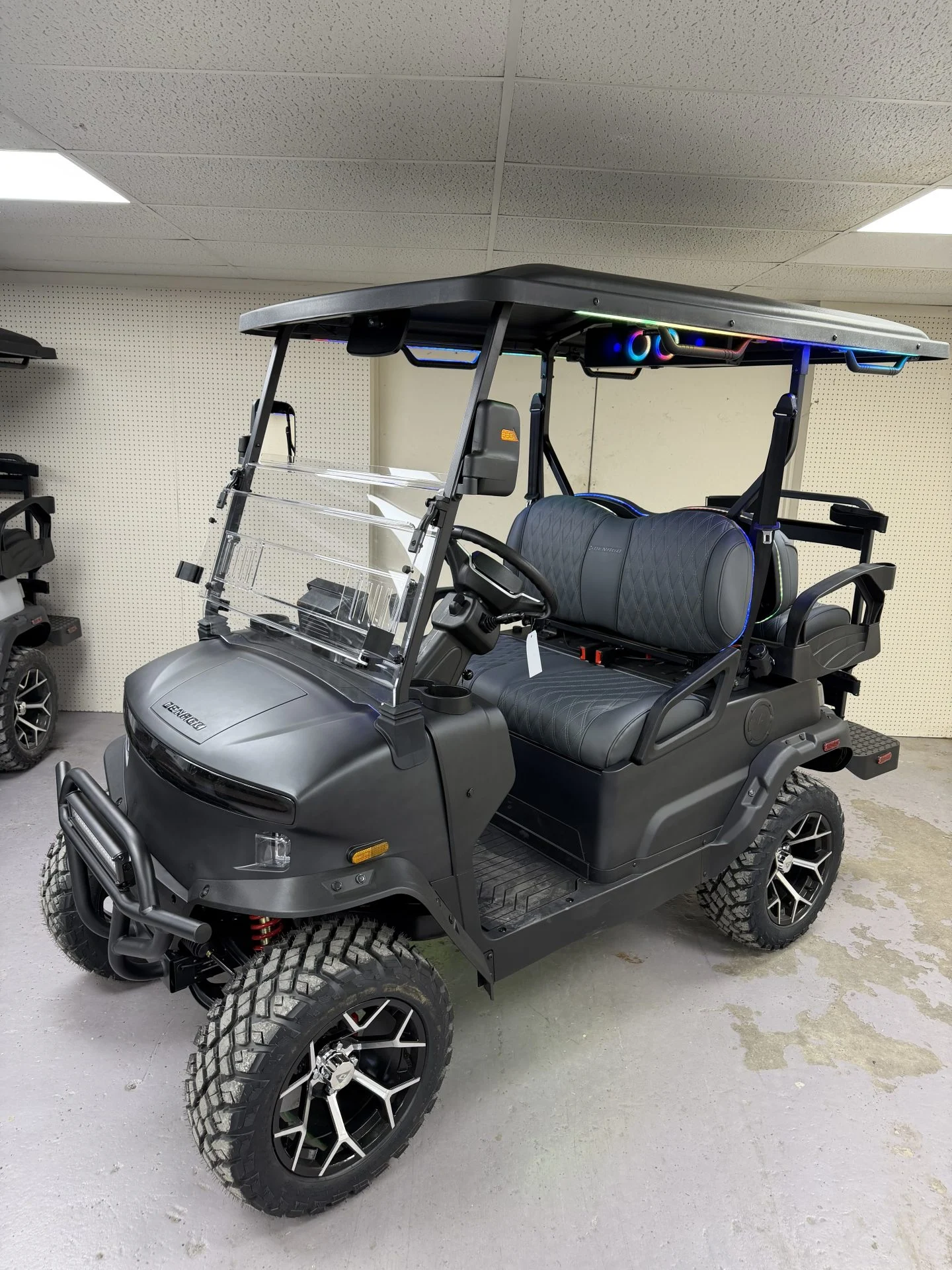 Enviro Carts is honored to present this 2026 Denago EV Nomad XL Electric Golf Cart for Sale. Powered by an all-electric powertrain with advanced Lithium battery technology, this lifted cart delivers a smooth, silent, and eco-friendly ride with exceptional range for up to four passengers. The sleek Black exterior paired with a stylish Grey interior provides a bold, sophisticated look perfect for family cruising, golf course navigation, and neighborhood adventures.